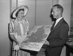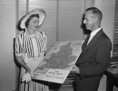 B. V. Haberer, office manager of Leonard Brothers, presents $50 in dimes to Mrs. Enoch H. Totten, representative of the British War Relief Society. The dimes are arranged on a map in the shape of Great Britain.