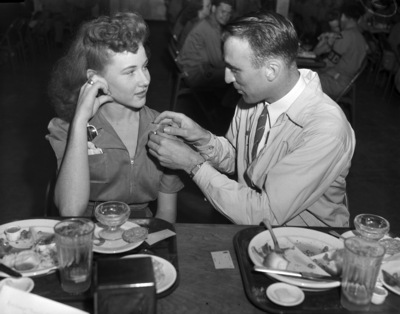 A banquet and dance were given at Stamford Saturday night for the 19 flying students who completed the first training period at Arledge-Stamford Field and will enter the basic air corps training school at Randolph Field for the second of the three stages leading to pilot ratings and commissions at second lieutenants. Cadet William Prehn of St. Louis, Missouri, pins a pair of wings on Miss Louise Phillips of Abilene, Texas. Miss Louise Phillips has sunglasses on her front breast pocket of her shirt. Both are sitting at the dining table. There are dinner plates with leftovers, spoons and tumblers on the table.