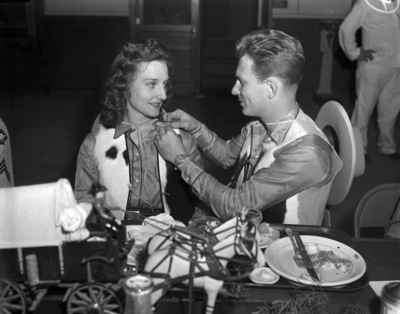 A banquet and dance were given at Stamford Saturday night for the 19 flying students who completed the first training period at Arledge-Stamford Field and will enter the basic air corps training school at Randolph Field for the second of the three stages leading to pilot ratings and commissions at second lieutenants. Frank Weatherbee of Galveston, Texas, pins his wings of Miss Marie O'Brien of Stamford, Texas. Each of the cadets was given a pair of wings to present to his date. Miss Marie O'Brien is wearing a fur. Both are sitting at the dinner table. There are plates with leftovers and a miniature chuck-wagon on the table in front of them.