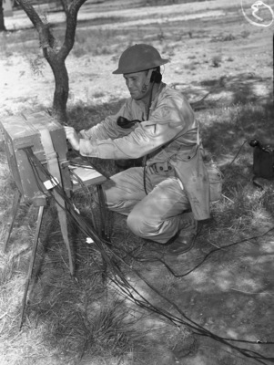 Communications personnel of the 36th Division at Camp Bowie moved out for command post exercises. Private Clyde W. Robertson, of Houston, Texas, member of the Headquarters Company, 144th Infantry, is using a field telephone switchboard to route a call between the front lines and regimental headquarters. He is wearing his military uniform and is kneeling on the grass to work on the switchboard. Private Robertson was a football and basketball letterman at Texas Christian University in 1928-30.