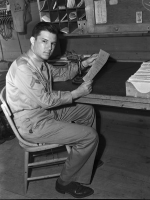 Communications personnel of the 36th Division at Camp Bowie engaged in command post exercises. Corporal John Hopkins, of Fort Worth, Texas, former KFJZ radio station announcer, is sitting at the microphone of headquarters company public address system, giving instructions on what to take for two weeks of field training. He is wearing his military uniform and holding a sheet of paper.