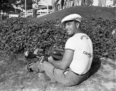 Norman Young of Handley with caddy in the Open at Colonial Country Club; wears the new uniform of the tournament -- blue trousers, white cap and shirt, red badges; "45th U.S.G.A. Open 1941 Colonial Club Fort Worth" is printed on back of shirt, 06/01/1941