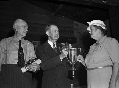 The reunion association of Springtown Male and Female Institute and College Hill Institute met at Springtown, Texas, Sunday, June 1, 1941. Mrs. Nannie Bevil DuBoss, of Tulsa, Oklahoma, right, is receiving an award for being the former student attending from the greatest distance. Presenting the award is Doctor Thomas P. Everett, center, of Weatherford, Texas, outgoing president of the reunion association. G. A. Frazier, left, 88, the oldest patron present for the reunion, looks on. Mr. Frazier is wearing a suit without the jacket and is holding a box. Doctor Everett is wearing a pinstripe double-breasted suit and is holding a trophy. Mrs. DuBoss is wearing a dress and a hat.