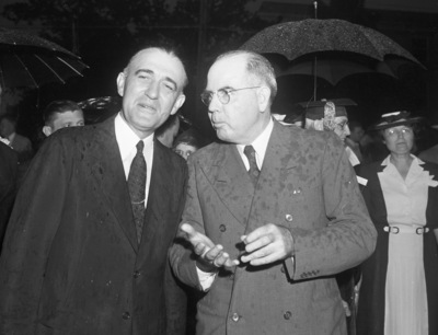 Dan D. Rogers, right, of Dallas, Texas, with Doctor M. E. Sadler, president-elect of Texas Christian University (TCU), at the ground-breaking ceremony for the first unit in the school's $1,500,000 expansion program. Mr. Rogers is the chairman of the state committee on expansion. Both men are standing outside and are wearing suits. Mr. Rogers is wearing eyeglasses. There are unidentified people in the background, holding umbrellas.