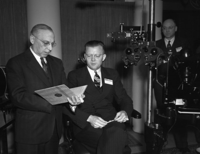 More than three-hundred people including school teachers and college students, registered for the Southwestern Congress of Optometry's Conference on reading disability. The four-day conference is being held at the Hotel Texas. Of interest to the optometrists is the new equipment display. Nelson Greeman of San Antonio, president of the Southwestern congress, tries out a new type chair while Doctor R. F. Pray Senior takes notes. Doctor Pray, from Beaumont is a past president of the Texas Optometry Association. Published in the Fort Worth Star-Telegram morning edition, February 1940.