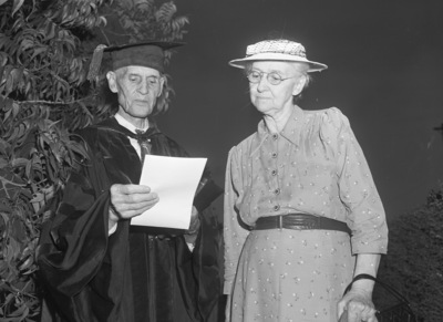 A veteran of the Texas Christian University (TCU) faculty and a past president of the university, Dr. Clinton Lockhart, left, head of the Department of Old Testament in Brite College of the Bible, shown with Mrs. Clinton Lockhart at the 68th annual commencement exercises on the TCU campus. Dr. Lockhart participated in both the commencement program and in ground-breaking ceremonies held earlier for a new dormitory for girls. Dr. Lockhart is wearing commencement robes and cap and is holding a sheet paper. Mrs. Lockhart is wearing a printed dress, belt, hat and eyeglasses. She is holding a purse.