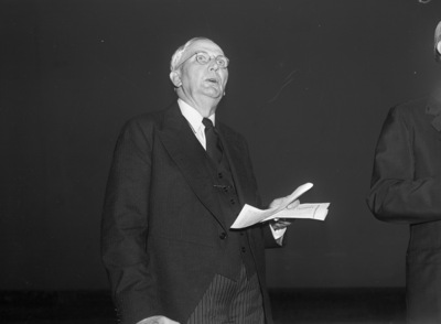 Texas Christian University (TCU) president emeritus E. M. Waits at the ground-breaking ceremony for a new girls' dormitory on the TCU campus. He is standing, wearing a suit and eyeglasses, and is holding sheets of paper in his left hand.