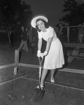Miss Florrie Buckingham, of Sulphur Springs, Texas, secretary-treasurer of the Texas Christian University (TCU) Student Body Council, at the ground-breaking ceremonies for the university's new $300,000 dormitory for girls, the first unit in a $1,500,000 expansion program. Miss Buckingham is standing outside, holding a shovel. She is wearing a dress, gloves, and a hat.