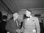 Congressman Martin Dies Junior of Orange, Texas, right, and Dr. Webb Walker. Dies, a candidate for the United States Senate, was in Fort Worth, Texas to address supporters at Capps Park. The men are shaking hands. Congressman Dies is wearing a doublebreasted suit and bow tie, with several pens in his breast poakcet. Dr. Walker is wearing a suit and tie with a pocket squire in his breast pocket. This photograph appeared in the June 4, 1941 morning edition of the Star-Telegram.