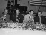 Camp Wolters is hosting a farewell banquet in Mineral Wells, Texas for the officers of the Company B, 60th Infantry Training Battalion. Attending the dinner left to right are Second Lieutenant Paul B. Kimberling, Second Lieutenant Richard B. Person, Chaplain Thomas Manley, and Captain Charles M. Dewey. Lieutenant Kimberling is wearing a suit. Lieutenant Person is dressed in a double breasted suit with a bowtie. Chaplain Manley is wearing a light colored suit. Captain Dewey, battalion executive officer, is wearing a pinstripe suit. The men are sitting behind a table in the banquet hall. There is a grand piano and an American flag in the background. Published in Fort Worth Star-Telegram, morning edition, June 5, 1941.