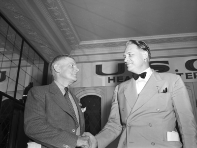Image shows Congressman Martin Dies Junior of Orange, Texas, right, and Dr. Webb Walker. Dies, a candidate for the United States Senate, was in Fort Worth, Texas to address supporters at Capps Park. The men are shaking hands. Congressman Dies is wearing a double-breasted suit and bow tie, with several pens in his breast pocket. Dr. Walker is wearing a suit and tie with a pocket squire in his breast pocket. This photograph appeared in the June 4, 1941 morning edition of the Star-Telegram.