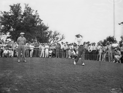 U. S. Open Golf Association open tournament. Iverson Martin, right, hitting the first ball. At the left is his partner, Bob Hamilton of Helfrich Field Golf Club, Evansville, Indiana.
