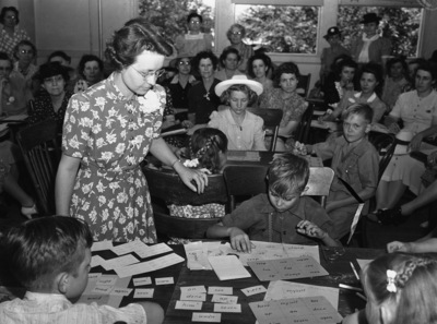 Teachers; Students; Testing; Demonstrations; Reading; Reading Clinics; Dresses; Eyeglasses; Hats; Children