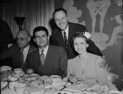 Guests at an appreciation dinner at the Blackstone Hotel for State Highway Commissioner Reuben Williams, of Fort Worth, Texas, and his predecessor, Harry Hines, of Wichita Falls, Texas, included, left to right, Mr. Williams, Mrs. Williams, and State Senator Jesse Martin (standing). Mr. and Mrs. Williams are sitting at a dinner table that is covered in plates, drinks and food. An unidentified man is sitting at the far left, beside Mr. Williams. Mr. Williams and Senator Martin are wearing suits and Mrs. Williams is wearing a dress.