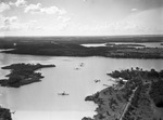 A birds'-eye view of five two-motor Consolidated bombers, shown resting on the surface of Lake Worth. They arrived in Fort Worth, Texas, and were scheduled to take off for Norfolk, Virginia, and will go into service with the United States Navy. Each of the planes, which are en route from the West Coast, carries a crew of seven men. The group of planes was the largest to be at the lake at one time.