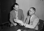 E. D. Lance, left, chairman of the Moving Picture Operators Local No. 330 union, shown purchasing three $1,000 bonds from R. L. Hosea, vice president of the Morris Plan Bank. The three bonds are of the Series F type and mature to face value in 12 years. Both men are sitting behind a desk and are wearing suits. Mr. Hosea is wearing eyeglasses.