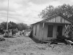 Shot of a house in Albany, Texas which was carried several hundred yards by flood waters. Adults and children are standing and sitting outside of the house. In the background are several trees.
