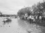 View of Hubbard Creek, where most of the Albany, Texas flood victims' bodies were found (bodies not shown). Several people are standing beside the creek and on the bridge in the background. One man, far right, foreground, is holding a bundle of rope. There are several trees along the creek.