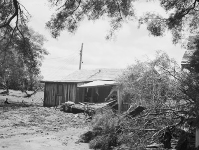 One of the houses that was moved for hundreds of yards by the flood waters in Albany, Texas. There are several trees around the house.