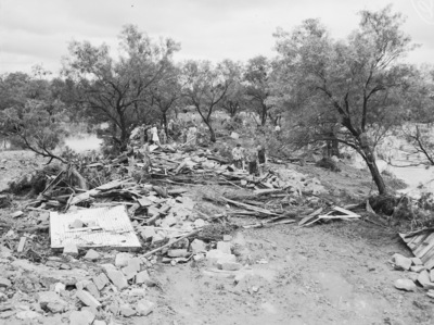 Wreckage of homes that were demolished by the flood in Albany, Texas. About 40 homes in all were destroyed or washed away by the flood. Several people are standing around, searching through the remains. Trees are in the background.