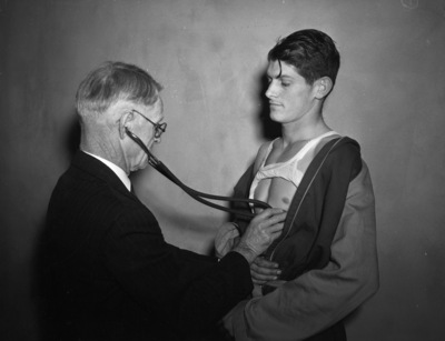 The semifinals and final round of the Fort Worth district Golden Gloves will be held at the Will Rogers Memorial Coliseum. Before the match Dr. T. H. Cheatham is examining one of the top boxers, Andy Eagleton. The medical staff inspects all the boxers before they are cleared to step into the ring. In 1939, Eagleton won the district middleweight championship. He is hoping to repeat that success tonight.