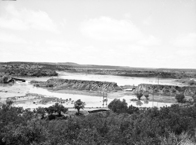 Shot of the earthen dam of Lake Diller reservoir, which washed out and released a flood on Albany, Texas. Two large breaks in the wall can be seen. In the foreground and background are several trees. Published in the Fort Worth Star-Telegram evening edition June 11, 1941.