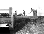 Image shows a shot of a bridge and group of six unidentified people help cleaning up debris from a flood at Albany. Second from right is a unidentified person pointing.