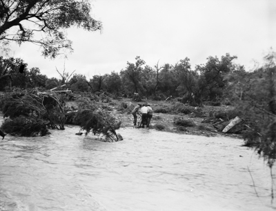 Jack Alsobrook and two unidentified people shown as he discovered one of the bodies of the flood victims in Albany, Texas. He and others are standing beside a body of water and surrounded by trees.