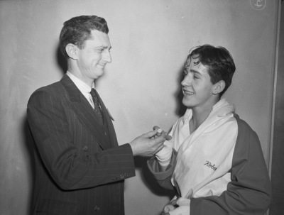 The semifinals and final round of the Fort Worth district Golden Gloves will be held at the Will Rogers Memorial Coliseum. But one doesn't have to win the title to receive a button. E. P. Haltom, chairman of the Golden Gloves awards committee, is presenting Robert Ballew with his Golden Gloves button. Every boxer who competes gets the award. Ballew won his first fight and lost his second. Mr. Haltom is dressed in a double breasted pinstripe suit. Ballew is wearing a robe.
