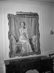 Portrait of Mrs. John Herbert, artist unknown. The painting is placed above a decorative table and is contained in a gilt frame. Mrs. Herbert is sitting on a divan, wearing well-fitting silk dress. A fur coat is beside Mrs. Herbert on the divan.