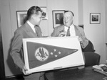 Carrol F. Hinners, left, presenting Fort Worth, Texas, mayor, I. N. McCrary, with the flag of the American Airlines flagship "Fort Worth." The flag, a bit frayed on the edges, was replaced with a new one when the "Fort Worth" completed 1,000,000 miles of flying. Mr. Hinners, American Airlines sales manager, had the old flag framed and gave it to the mayor "as a reminder that the Flagship Fort Worth" is still flying from coast to coast. Both men are standing in a room behind a desk and are wearing suits.