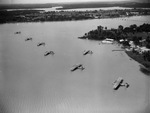 Aerial of Lake Worth's seaplane dock and 7 coastal Navy patrol bomber planes on the lake; Holden's Boat Works middle far right, Casino Beach upper right.