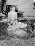 Barbara Jean Reams, nine-year-old, daughter of Mr. and Mrs. V. A. Reams, holding a violin amidst the wreckage of the home of her grandparents, Mr. and Mrs. Fred Tankersley, after a flood near Albany, Texas. Miss Reams is sitting outside the house and is wearing a dress.