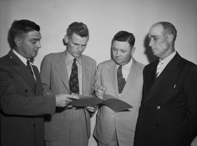 Scanning a list of prospective and absent members before they go calling on them are four leaders of the Bremen Bible Class of Rosen Heights Baptist Church. The officers are, left to right, F. J. Fairchild (teacher), Freelin Anderson (first president), Jimmie Sessom (incumbent president) and J. J. White (vice president). The four men are standing in front of a blank wall, all wearing suits. Mr. Fairchild and Mr. Anderson are holding the list of names as all the officers look on.