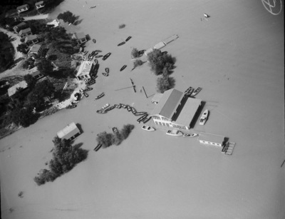 Air view of the John Roach Camp standing in three feet of water after flooding at Eagle Mountain Lake. Several boats, buildings and trees can be seen. Published Fort Worth Star-Telegram Morning Edition June 13, 1941.