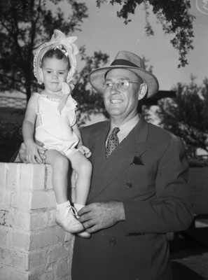 E. F. Springer with his daughter, Sue Ann, two-and-one-half years old. They are celebrating the United States' 31st observance of Father's Day. Sue Ann is sitting atop a brick ledge, with her father's arm around her back keeping her upright. She is wearing a light-colored romper with lace detailing along the edges and a bonnet with matching details and a bow. She is wearing a ribbon in her hair. Mr. Springer is wearing a suit with a handkerchief in the breast pocket, a hat and eyeglasses. They are outside; there are trees in the background.