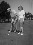 Reub Berry shows his daughter, Jalle, 14, how to putt at Colonial Club. They are celebrating the United States' 31st observance of Father's Day. Mr. Berry is wearing a short sleeved button-down shirt, trousers and a hat. He is holding a golf club next to a golf ball, preparing to putt. Jalle is wearing a ribbon in her hair, a short sleeved button-down blouse and a tri-color-blocked skirt. The top third of the skirt, starting at her waist, is a light color, the middle third is a darker color, and the bottom third to the hem is an even darker color. Behind them are several trees.