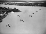 Aerial view of seven coastal patrol bombers which were roosting on Lake Worth near the municipal seaplane base. The air view of the land and water areas surrounding the base shows the upper reaches of the lake, the Northwest Highway, Casino Beach, pilings of the of Nine Mile Bridge and the municipal dock and fuel station.
