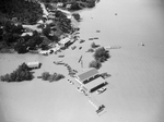 Image shows Air view of the John Roach Camp standing in three feet of water after flooding at Eagle Mountain Lake. Several boats, buildings and trees can be seen. Published Fort Worth Star-Telegram Morning Edition June 13, 1941.
