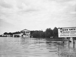Image shows high water at Eagle Mountain Lake. View of the John Roach Camp at Eagle Mountain Lake, nearly covered by high water. The camp could only be reached by boat. Water stood more than two feet over the first floor level and docks extending from the front of the camp were submerged under four feet of water. A advertisement sign called "Good Eats" is shown on right. Published Fort Worth Star-Telegram Evening Edition June 12, 1941.