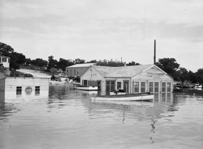 Image shows high water at Eagle Mountain Lake. View of the John Roach Camp at Eagle Mountain Lake, nearly covered by high water. The camp could only be reached by boat. Water stood more than two feet over the first floor level and docks extending from the front of the camp were submerged under four feet of water. A house is shown to be submerged underwater while a boat is in front. Published Fort Worth Star-Telegram Evening Edition June 12, 1941.