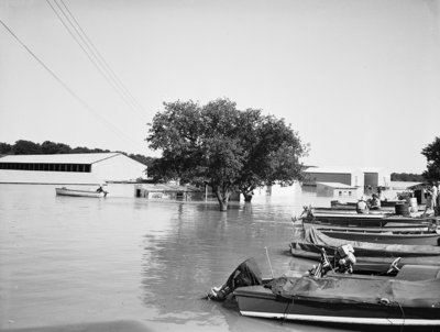 Image shows Shot of Marion Herring's boat works and store at Eagle Mountain Lake, flooded by high water. The store (left) had water standing four feet over the floor. Right foreground shows one of Mr. Herring's five floating boat houses, built to rise with the lake. On the right unidentified people are shown on boats. Published Fort Worth Star-Telegram Evening Edition June 12, 1941.