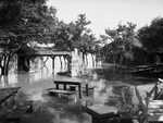 Image shows high water at Eagle Mountain Lake. View of the John Roach Camp at Eagle Mountain Lake, nearly covered by high water. The camp could only be reached by boat. Water stood more than two feet over the first floor level and docks extending from the front of the camp were submerged under four feet of water. A cabin and picnic area is shown surrounded by water that indicates the high water level. Published Fort Worth Star-Telegram Evening Edition June 12, 1941.