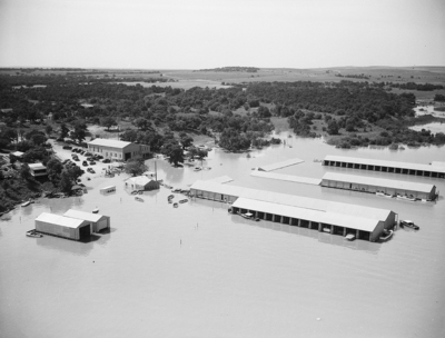 Image shows a aerial view of of the John Roach Camp standing in three feet of water after flooding at Eagle Mountain Lake. Several boats, buildings, warehouses and trees can be seen. In background cars are parked on the edge of the flooded area. Published Fort Worth Star-Telegram Morning Edition June 13, 1941.