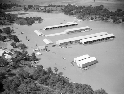 Image shows a aerial view of of the John Roach Camp standing in three feet of water after flooding at Eagle Mountain Lake. Several boats, buildings, warehouses and trees can be seen. On cars and boats are parked on the edge of the flooded area. Published Fort Worth Star-Telegram Morning Edition June 13, 1941.