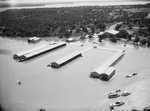 Image shows a aerial view of of the John Roach Camp standing in three feet of water after flooding at Eagle Mountain Lake. Several boats, buildings, warehouses and trees can be seen. On cars and boats are parked on the edge of the flooded area. Published Fort Worth Star-Telegram Morning Edition June 13, 1941.