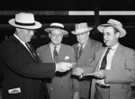 A. R. Fox (left) passenger traffic representative of the Missouri-Pacific Lines, sold most of the tickets to the Fort Worth delegation which left Friday for Washington for the hearing on the Trinity River improvement program before the Board of Engineers for Rivers and Harbors. His satisfaction over making a sale turned to downright glee when he took the money from R. C. Bowen (right), president of the Bowen Motor Coaches. R. Mayo Bowen, banker, next to Fox, and County Judge Miller enjoyed the situation as the bus man gingerly paid his money to the railroad man.
