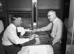 W. K. Stripling (left) and Charles F. Roeser are shown enjoying a game of backgammon in a compartment of one of the three special Pullman cars used by the Fort Worth river enthusiasts. The two are part of a delegation on their way to Washington for the hearing on the Trinity River Improvement Program before the Board of Engineers for Rivers and Harbors.