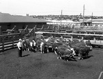 Cattle. Houton P. Hutchens, chairman of the agriculture committee of the Fort Worth Chamber of Commerce, shown with some cattle from the J. F. Barnes' Triangle Bar Ranch.