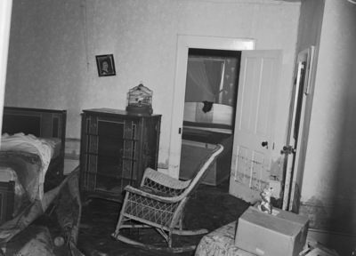 Interior shot of the Woolfolk house. A view of the bedroom and bathroom. The bedroom has a bed with a dresser next to it, a chair and other furniture are damaged by the flood.